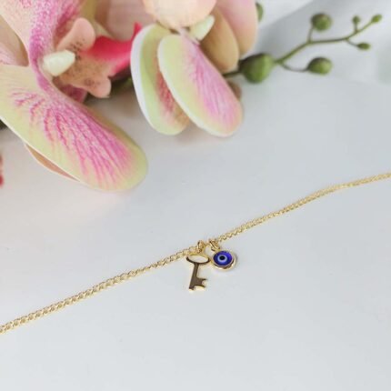 Tornozeleira com Pingente de Olho Grego e Chave Folheado em Ouro 18k