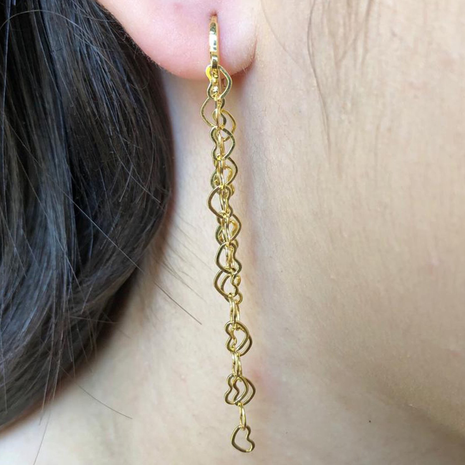 O brinco argolinha com corrente de coração é composto por uma mini argola articulada e uma corrente cheia de corações, que deixa a peça com um ar de romance e sofisticação.