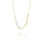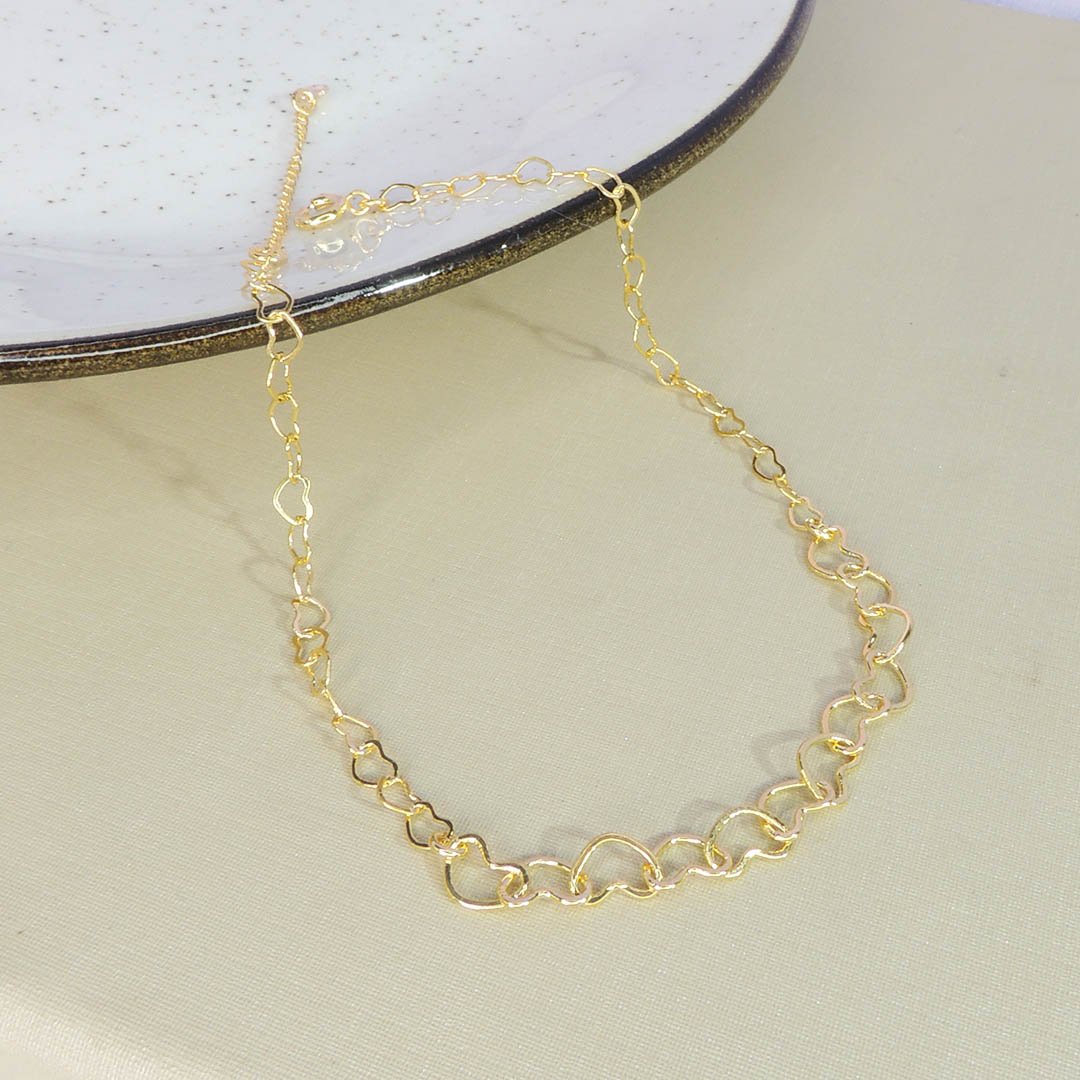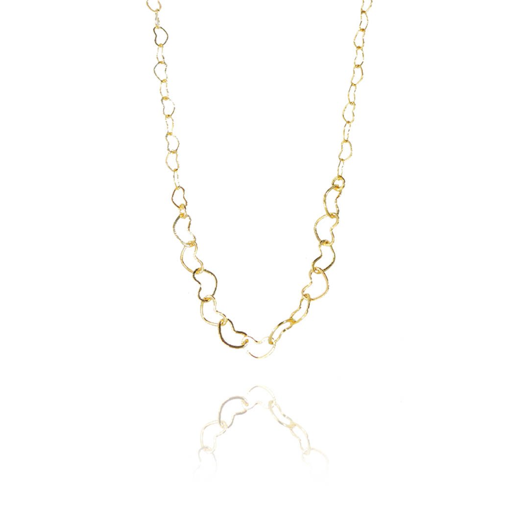 Uma corrente folheada em ouro 18k intercalada com mini corações é uma combinação apaixonante que completa suas composições pessoais sem dificuldade.